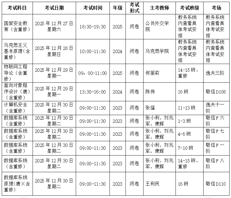 请同学们互相转告,不要错过考试时间,如有未查询到考试安排等特殊情况的请及时与学院教务办联系,办公电话:85155295。