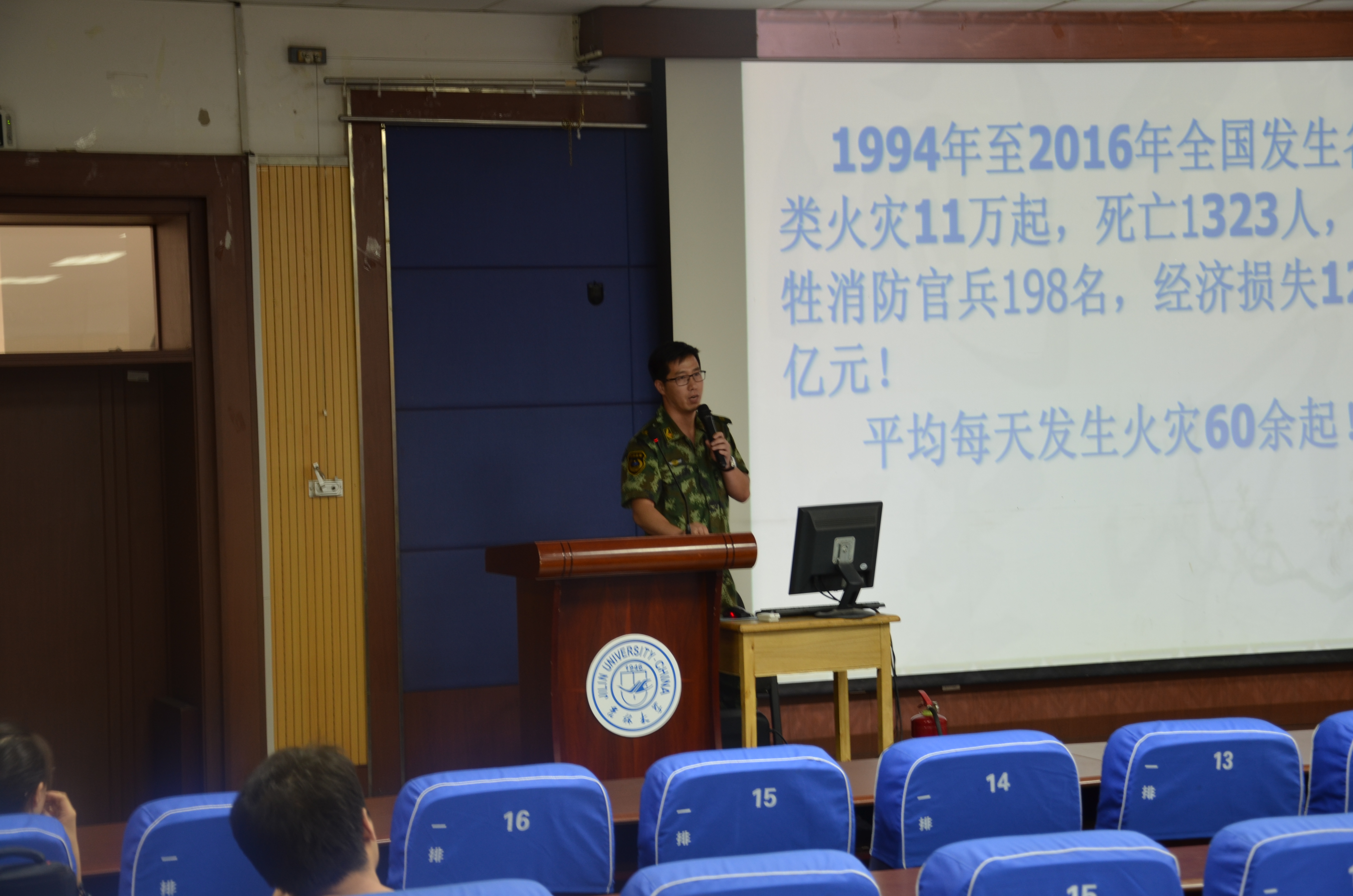 为提高同学们的安全防火意识,了解消防安全常识,掌握基本消防技能,8月25日下午,学院邀请保卫处周中平老师为新生开展了一场安全教育讲座。